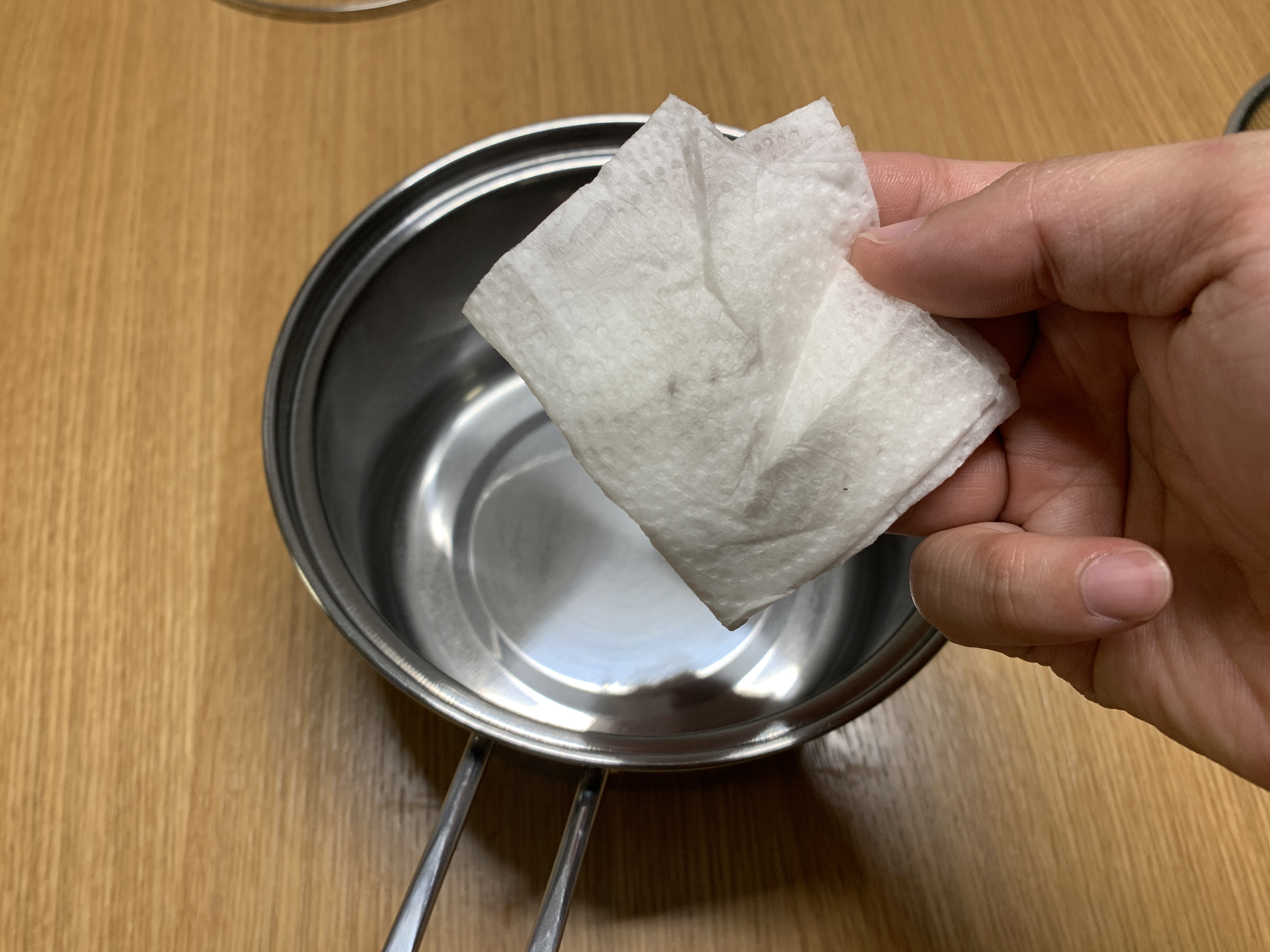 아시쥬~ 스테인레스 냄비는 연마제가 발라져 있어 키친타올에 식용유 묻혀서 빡빡 딱아줘야 하는거~